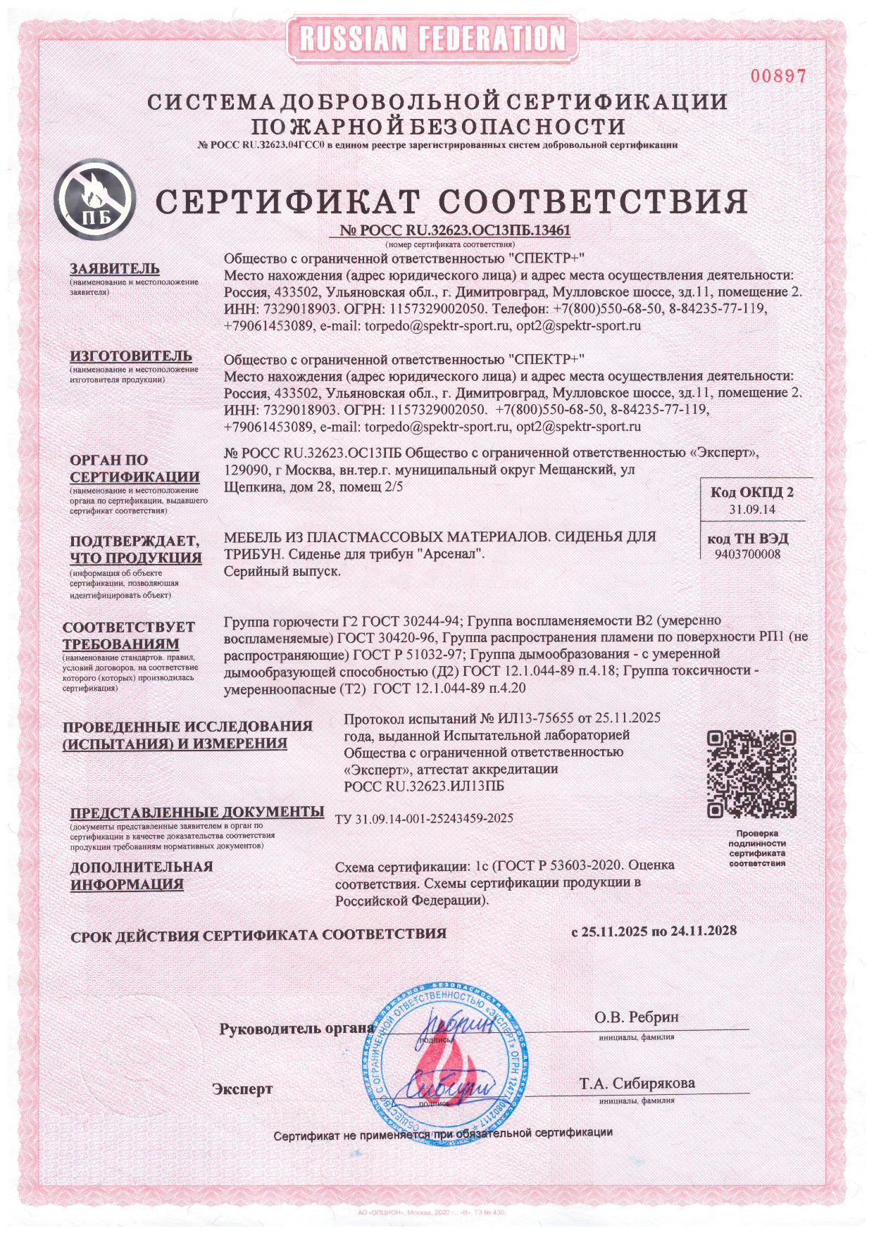 Сертификат соответствия (противопожарный сиденья Арсенал)